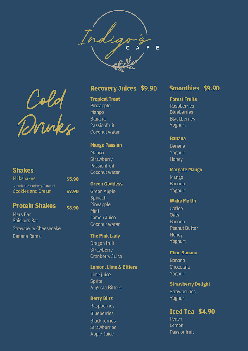 Introducing Indigo's Cafe, a charming spot located at 139 Margate Parade, Margate QLD. This delightful cafe is celebrated for its rich and aromatic coffee, including expertly crafted Cappuccinos, Long Blacks, and Espressos. Guests can also indulge in a variety of smooth and refreshing smoothies like Forest Fruits and Strawberry Delight.